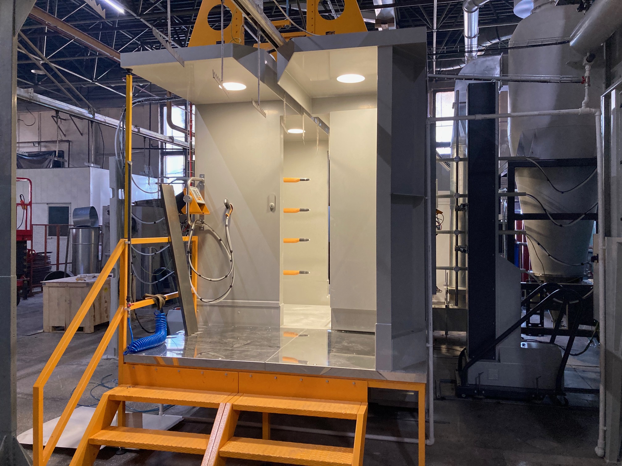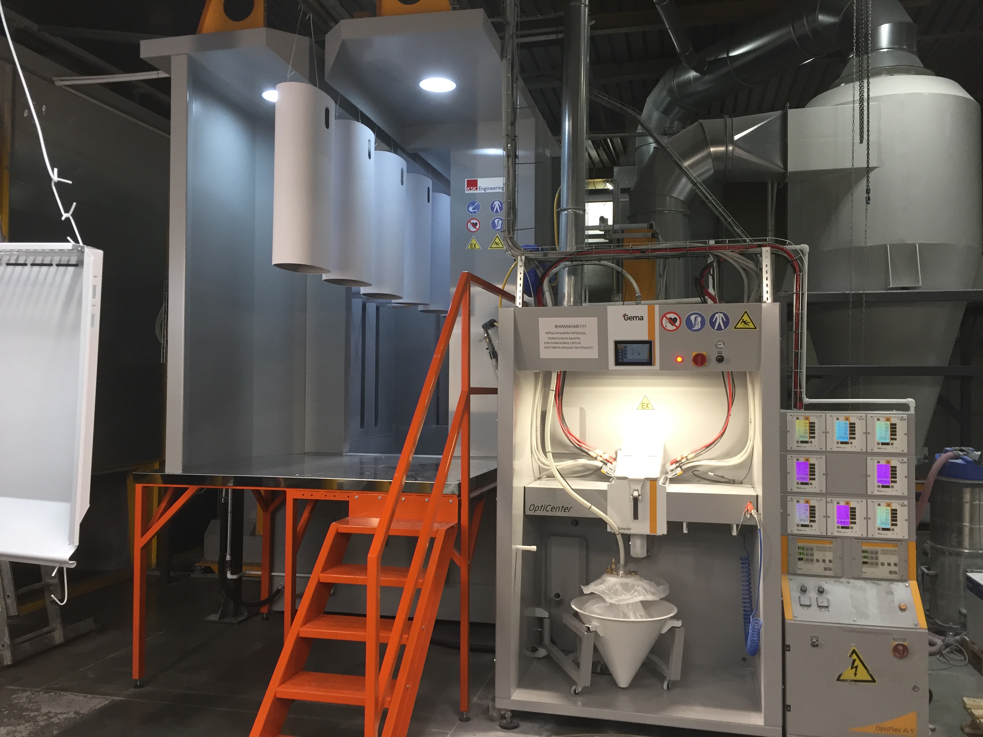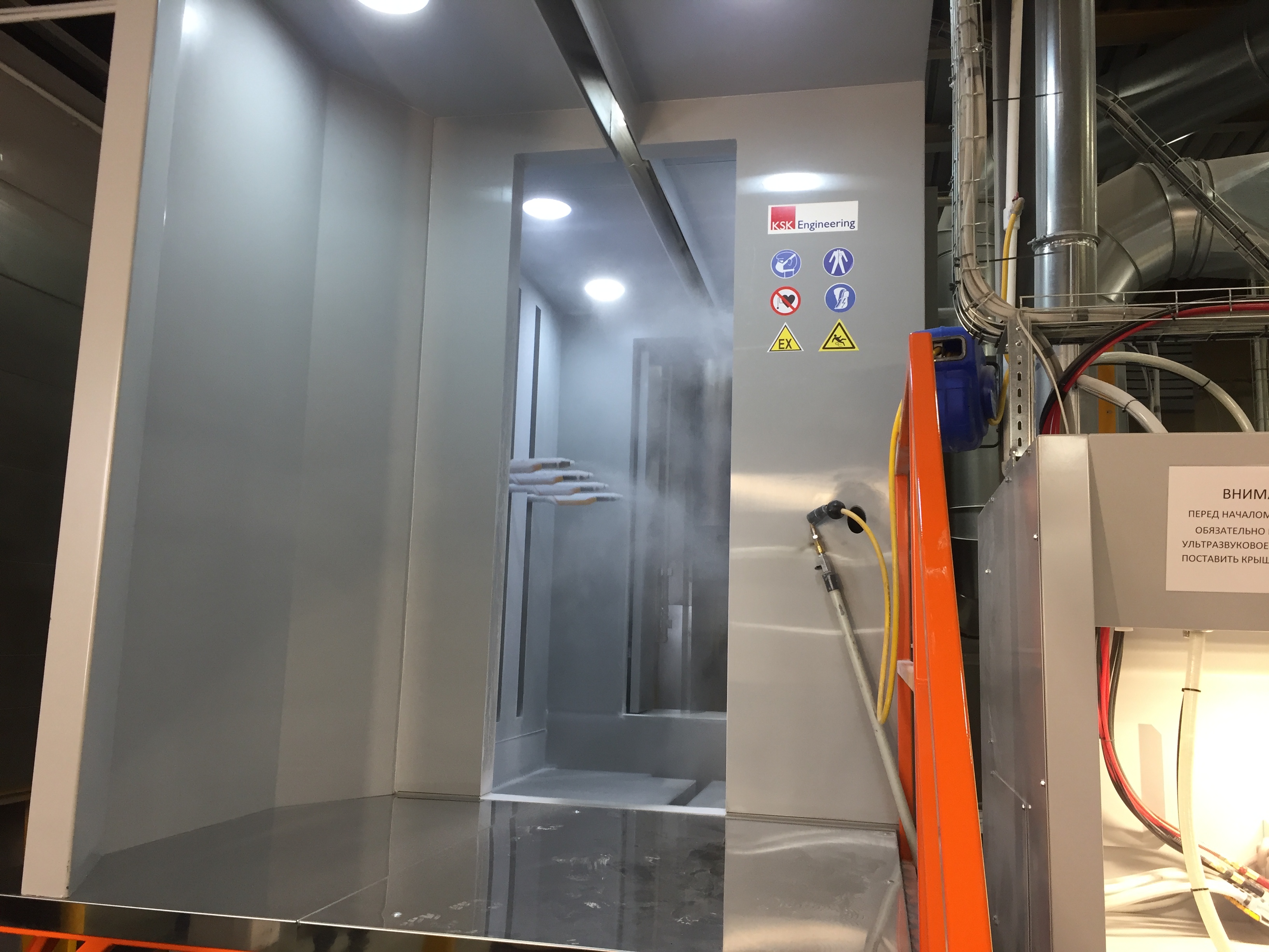 Камера позволяет производить быструю смену цвета благодаря антистатическим свойствам корпуса и отсутствию наслоений порошка внутри камеры. Всасывание воздуха организовано с пола равномерно по всей длине камеры. В процессе работы производится постоянная очистка пола камеры методом обдува сжатым воздухом через встроенные в пол форсунки. Ручные посты для подкраски могут быть добавлены по желанию клиента, на входе или выходе кабины.